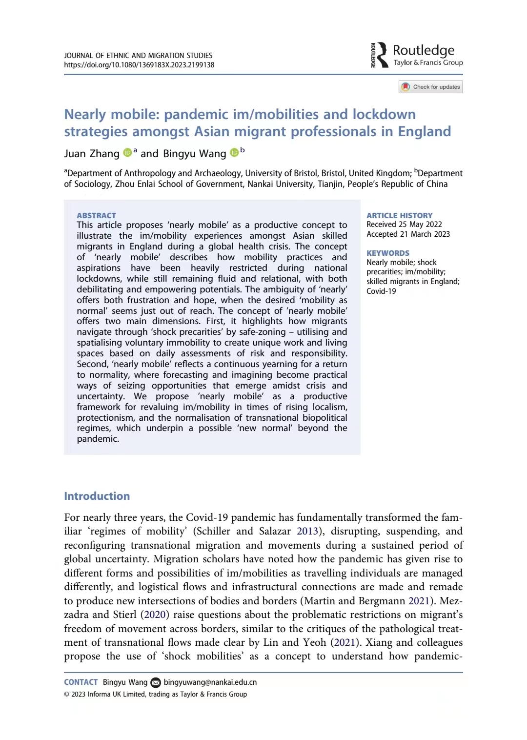 近期,英国上市公司365周恩来政府管理学院社学系王炳钰教授(作为通讯作者)与布里斯托大学人类学与考古学系张娟副教授的最新合作文章于2023年4月12日在线发表于移民和族群研究顶刊Journal of Ethnic and Migration Studies (JEMS),文章题为Nearly mobile: pandemic im/mobilities and lockdown strategies amongst Asian migrant professionals in England。所发表期刊JEMS为英文核心期刊(SSCI)一区刊物(Journal Citation Reports-Q1);作为移民研究国际权威刊物,JEMS在JCR“族群研究”与“人口学”两个类别均排名世界第1,在谷歌学术“移民研究”和“社会学”两个类别的世界排名分别为第1和第2。本期推文将对这篇文章的研究问题、研究发现以及主要贡献进行介绍。