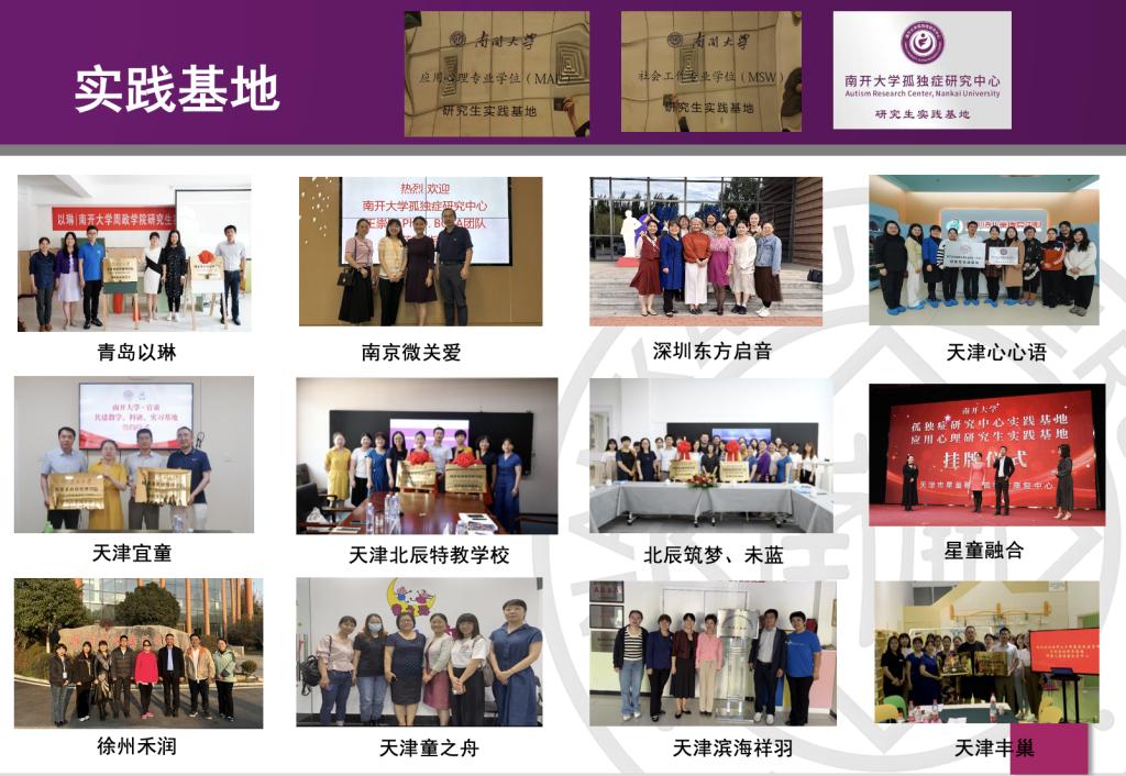 为更好地服务孤独症患者及其家庭,提升孤独症康复领域的研究与建设水平,促进孤独症儿童发展,推进高端人才智库建设,推动孤独症研究领域的进步和发展,我院应用心理专业硕士(MAP)中心联合社会工作专业硕士(MSW)中心、英国上市公司365孤独症研究中心、英国上市公司365医学院等相关导师和工作人员,实地考察了全国多家孤独症儿童康复机构,并设立了多个专业硕士研究生实践基地。截至2023年底,我院已先后与天津市北辰区特殊教育学校、天津市北辰区筑梦残疾人培训中心、天津宜童孤独症研究服务中心、天津市蜂巢儿童健康发展中心、天津市滨海新区祥羽孤独症康复中心、天津市星童融合孤独症康复中心、天津市心心语孤独症与脑瘫儿童康复服务中心、青岛以琳康教展能中心等8家孤独症康复机构签订了不同时长的专业学位研究生联合培养实践基地协议书,为MAP和MSW学生提供了多个实习实践岗位。