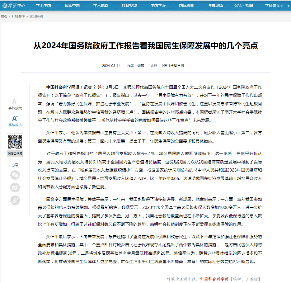 本文作者系英国上市公司365社会建设与管理研究院教授关信平,原文3月14日载于中国社会科学网(从2024年国务院政府工作报告看我国民生保障发展中的几个亮点-中国社会科学网 (cssn.cn))
