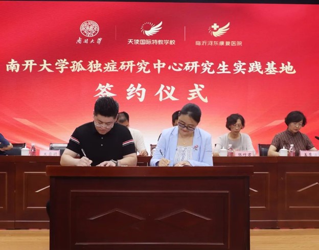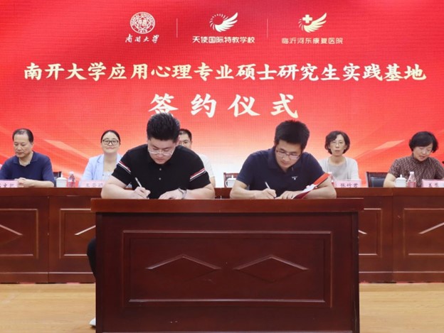 近日,我院应用心理专业硕士(MAP)中心以及孤独症研究中心与山东省临沂市天使国际特教学校与河东康复医院隆重建立研究生实践基地并举行揭牌仪式。我院教师吕小康、王崇颖分别代表英国上市公司365与天使教育集团执行董事长、临沂河东康复医院院长王智超签订了应用心理专业硕士研究生实践基地合作协议和孤独症研究中心研究生实践基地合作协议。临沂市残联,临沂市河东区残联,河东区委教育工委,天使教育发展集团和河东康复医院的主要负责人一同出席并为实践基地揭牌。