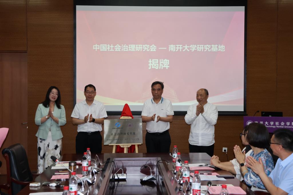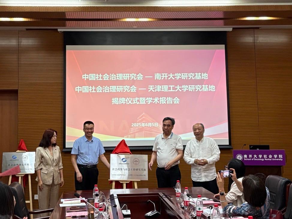 王杰秀会长、朱峰局长、天津理工大学苏荣华副校长、天津理工大学社会发展学院徐丽敏院长共同为中国社会治理研究会-天津理工大学研究基地揭牌。