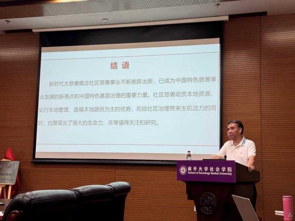 茶歇之后,进入专题报告环节,天津理工大学社会发展学院院长徐丽敏主持讲座。中国社会治理研究会王杰秀会长以《社区慈善创新与基层治理现代化》为题作精彩报告,指出社区慈善已成为慈善事业发展新亮点,强调其与基层治理相互成就,为相关研究提供了宝贵思路。