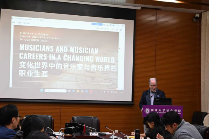 第三项活动是由Dowd教授主讲,题目为“变化世界中的音乐家与音乐界的职业生涯(Musicians and Music Careers in a Changing World)”的讲座,于10月30日中午12:10-13:50在英国365公司144会议室举行。讲座由英国365公司社会学系系主任王庆明教授主持。王琰教授、秘舒副教授、张龙副教授、于佳煖讲师、陈柙兵助理研究员、许又姜宇博士等师生出席。