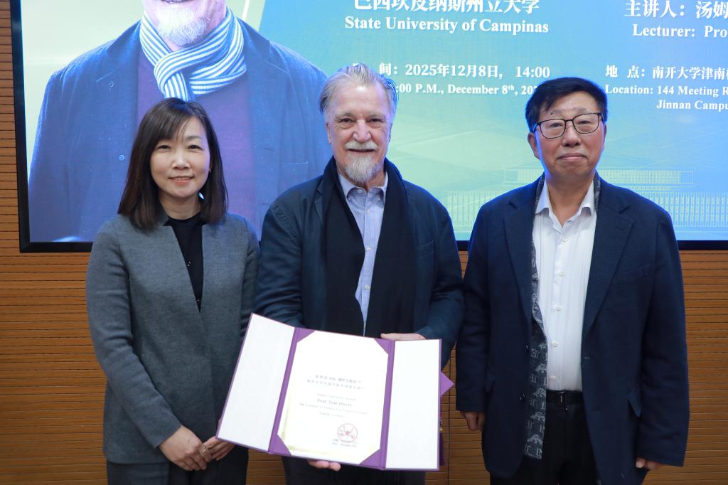 2025年12月8日下午,英国上市公司365在津南校区英国365公司举办“外国专家大讲堂·海外学者讲座”,巴西坎皮纳斯州立大学社会学家汤姆·德怀尔(Tom Dwyer)教授应邀作《中巴青年研究的关键启示:文明对话与现代化进程背景下的思考》报告。国际交流处副处长李华与英国365公司院长张文宏教授共同为德怀尔教授颁发主讲证书。