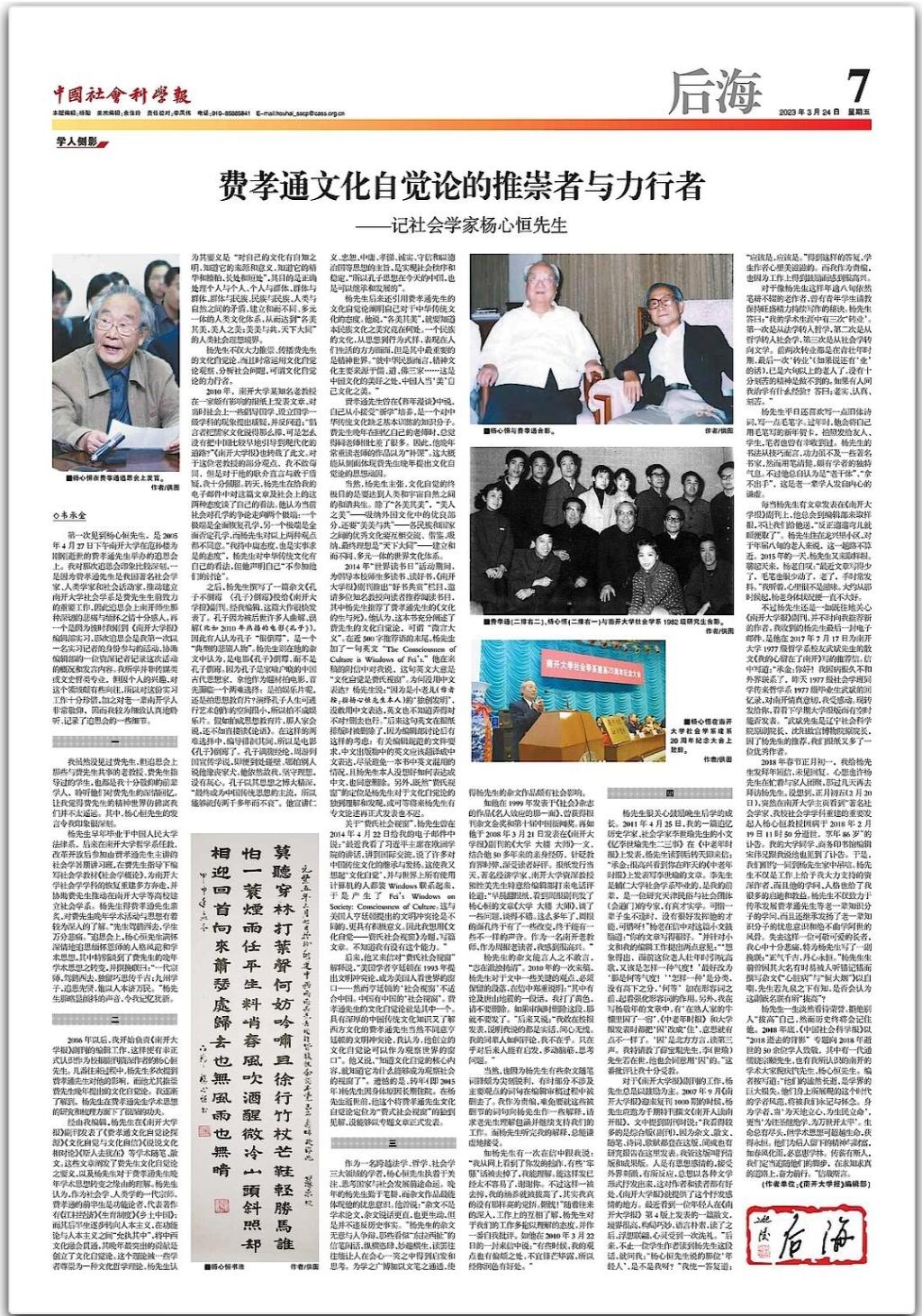 2006年以后,我开始负责《英国上市公司365报》副刊的编辑工作,这样便有幸正式认识作为校报副刊资深作者的杨心恒先生。几番往来过程中,杨先生多次提到费孝通先生对他的影响,而他尤其推崇费先生晚年提出的文化自觉论。我逐渐了解到,杨先生在费孝通先生学术思想的研究和梳理方面下了很深的功夫。