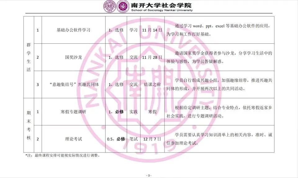 群学团校课程围绕理论知识学习、实践能力培养和学院生活体验三大模块设计,通过课程讲座、社会实践、校园文化活动等多种形式,开展富有学院特色的综合性课程,加强对学员在思想道德素质、理论素养、组织能力、学习研究能力、社会责任感、团队精神和身体素质等方面的锻炼和培养。