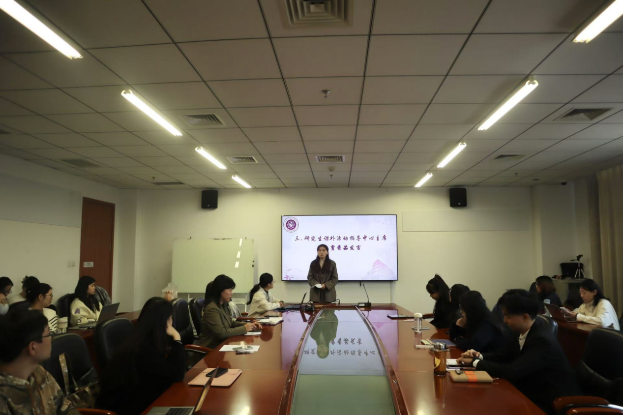研究生课外活动指导中心主席团成员衣起麟代文体部部长王琛旭汇报,文体部根据学生需要为大家准备了各式各样的文娱、体育活动,加强学生体育锻炼,丰富学生的课余生活。