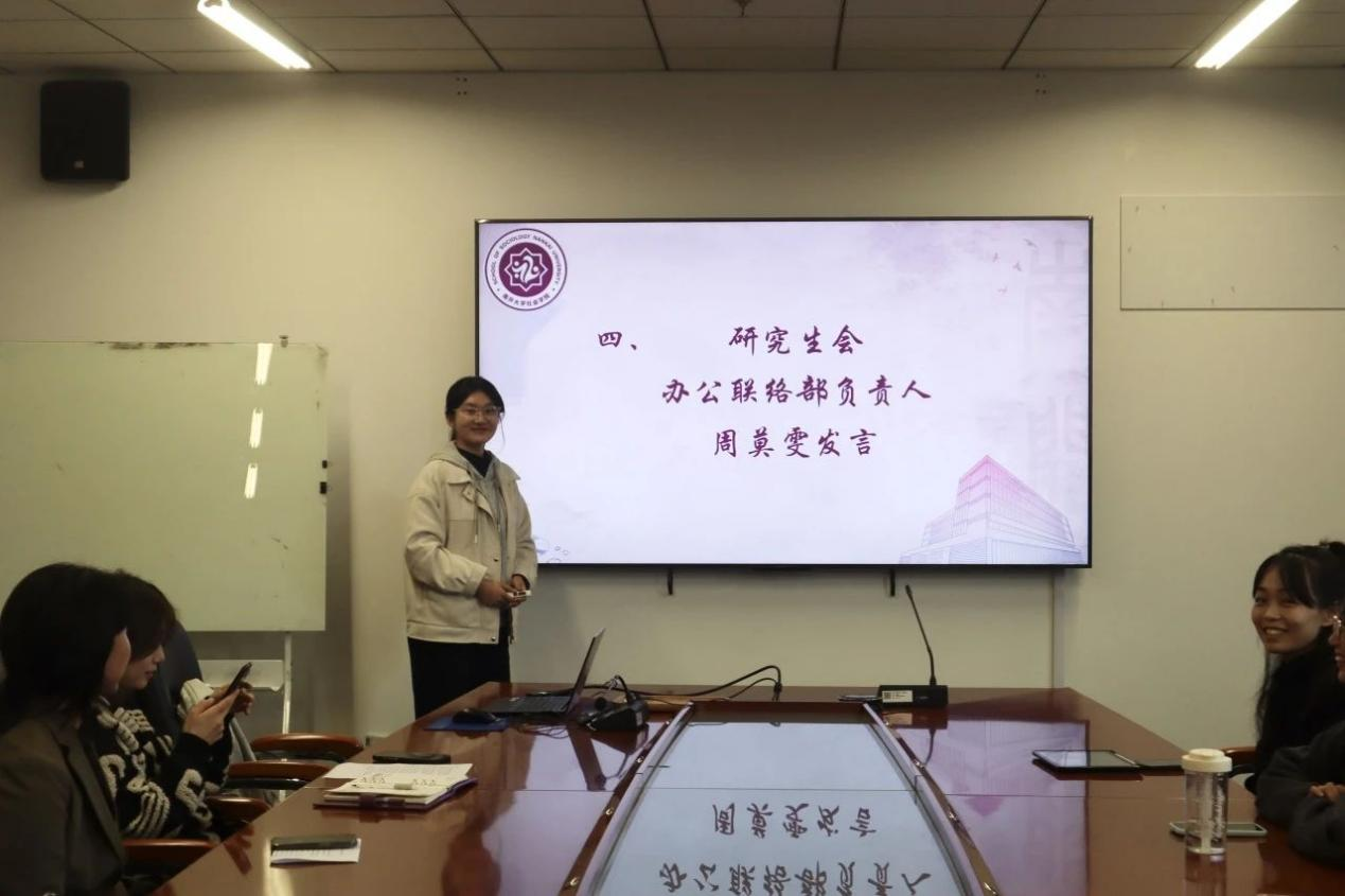 研究生会主席王美晨指出研究生会作为桥梁角色的重要性,承诺将秉承服务宗旨,深化学术交流,丰富校园文化生活,加强内外部联系,倾听同学心声,携手全体成员共同努力,为研究生群体创造更加多彩、有意义的学习生活环境。